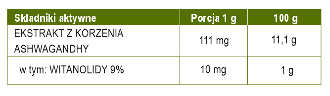 - Źródło Witanolidów - jedna porcja suplementu diety dostarcza do organizmu 10 mg Witanolidów 9%
