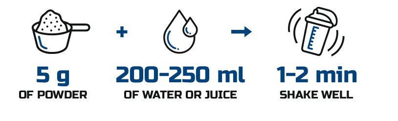 Odmierzyć jedną porcję – 5g (1 miarka), wymieszać ją w 200-250ml wody lub soku. Spożywać raz dziennie. Spożyć bezpośrednio po przygotowaniu.
