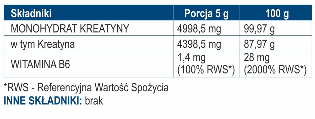 Składniki: Monohydrat kreatyny (200 mesh), witamina B6 (chlorowodorek pirydoksyny).