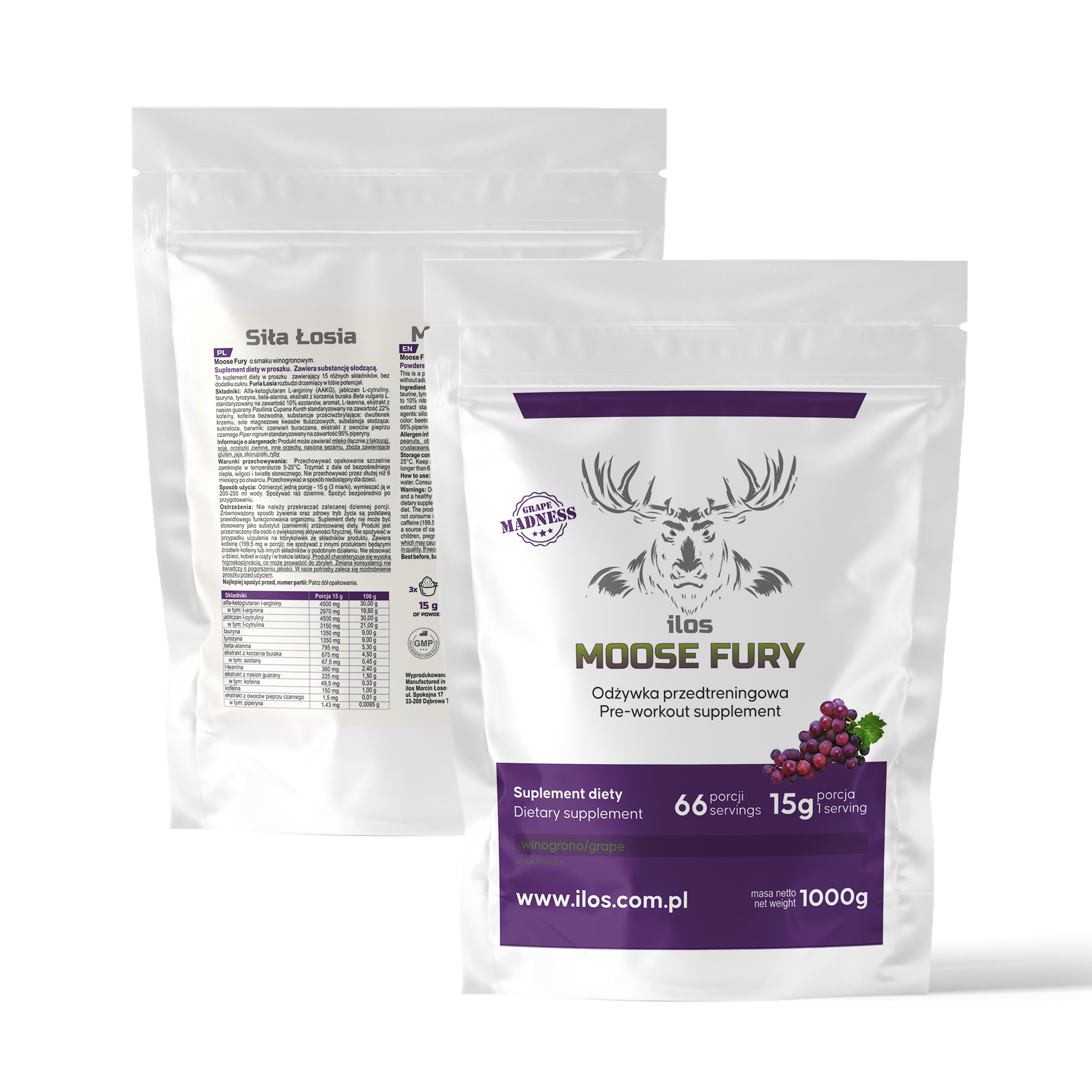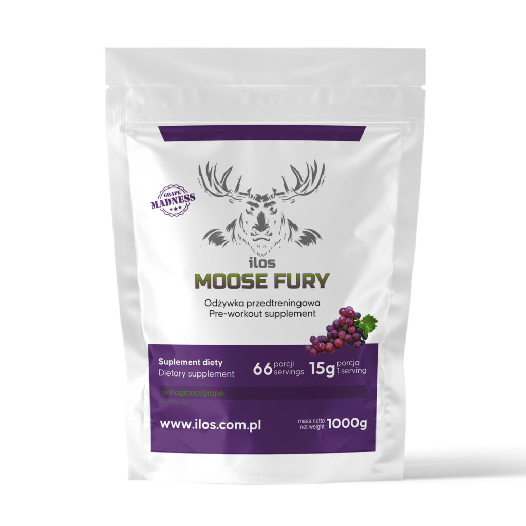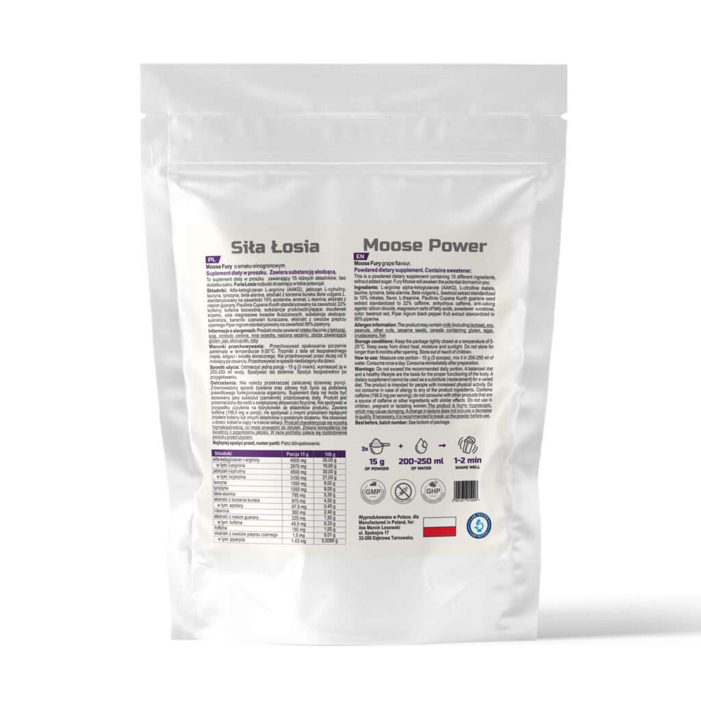 Moc, siła, energia, wytrzymałość płynące z natury – Furia Łosia rozbudzi drzemiący w tobie potencjał.  Suplement diety w proszku zawierający aż 15 różnych składników. Bez dodatku cukru.